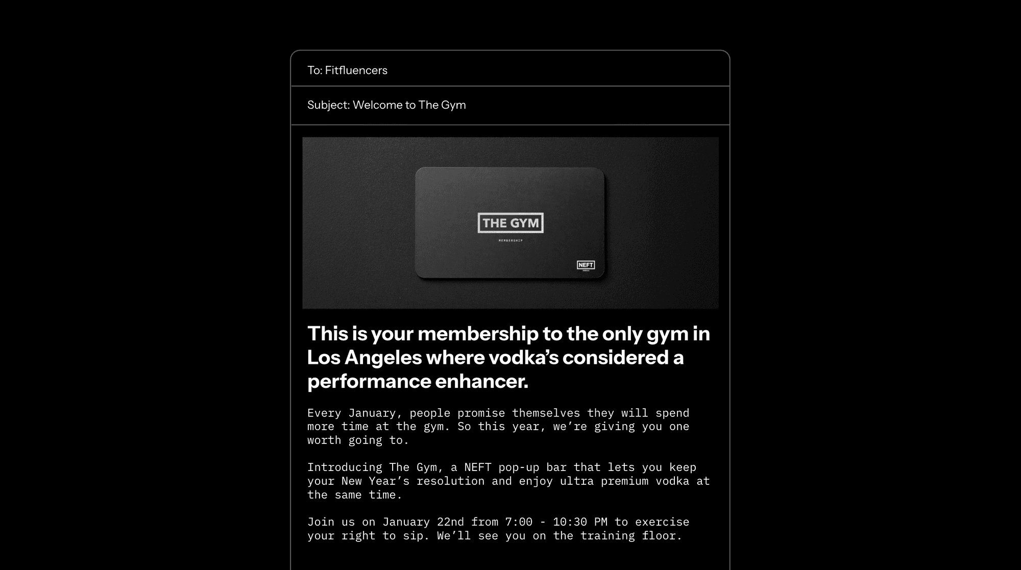 The Gym tapped into a universal late-January truth: most people abandon their resolutions before the month ends, yet still want to appear committed. No other alcohol brand had approached January this way, transforming two cultural rituals (gym resolutions and Dry January) into a single, playful experience that invited people to enjoy a better vodka while keeping up appearances.